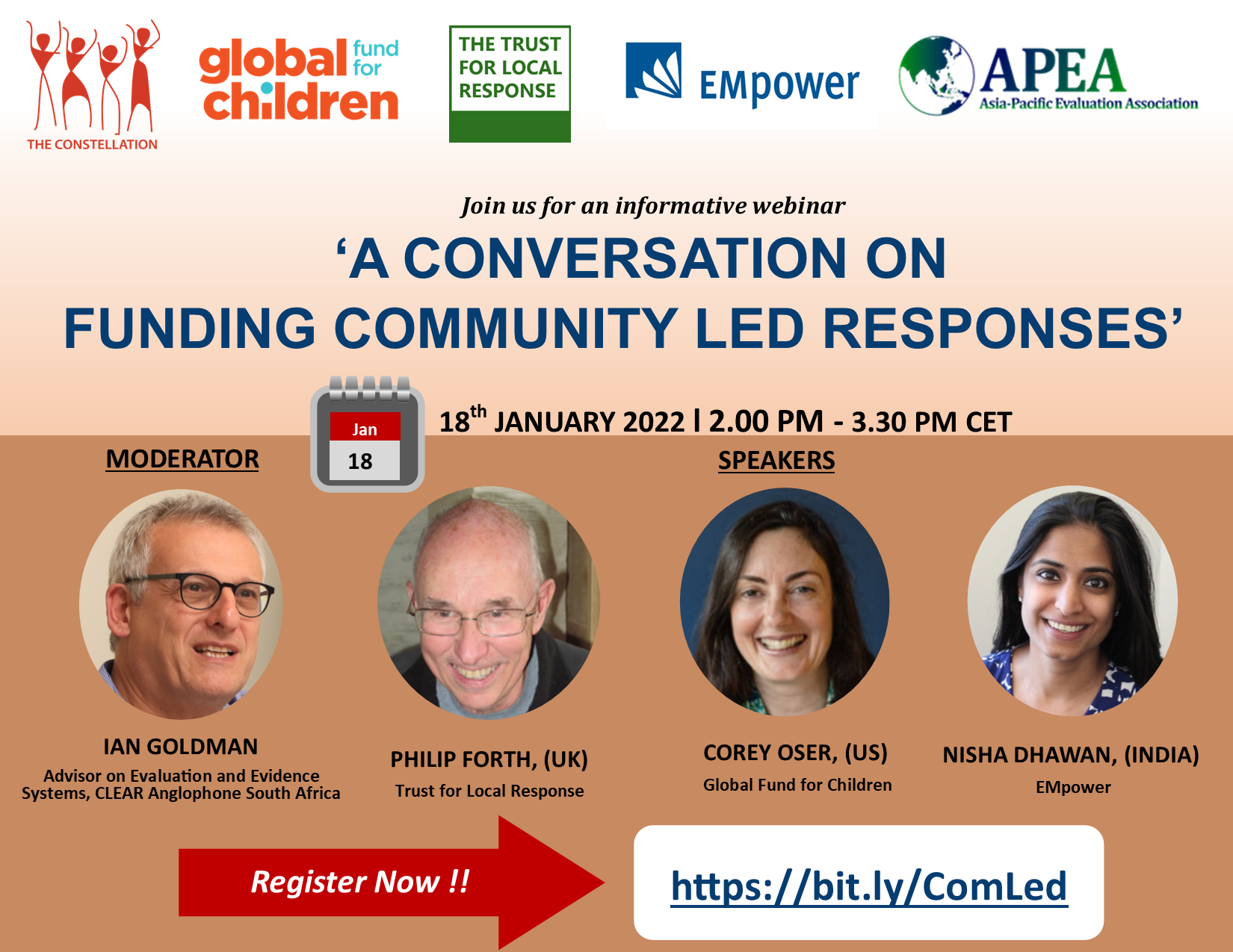 The Constellation and the Asia Pacific Evaluation Association organise a joint webinar: A conversation on Funding Community Led Responses. Speakers are Philip Forth, (UK) Trust for Local Response; Corey Oser (US) Global Fund for Children and Nisha Dhawan (India),  EMpower
